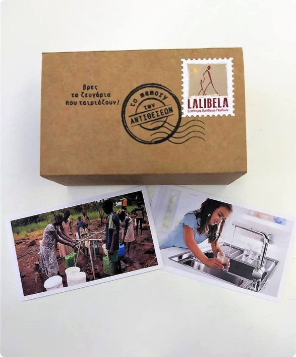 Μέρος εξόδων επανεκτύπωσης - ΠΑΙΧΝΙΔΙ ΜΝΗΜΗΣ LALIBELA - «To Memory των Aντιθέσεων». Στη Lalibela εδώ και χρόνια μας απασχολεί το πώς θα μεταφέρουμε στα παιδιά στην Ελλάδα την πραγματικότητα της Αφρικής, που είναι τόσο διαφορετική από τη δική μας. Έτσι αποφασίσαμε να κατασκευάσουμε ένα παιχνίδι γνωστό σε όλα τα παιδιά, το Memory. Μόνο που σε αυτό το Memory τα παιδιά καλούνται να βρουν τις αντίστοιχες θεματικά κάρτες από την Αφρική και την Ευρώπη (για παράδειγμα, ένα σπίτι στην Αιθιοπία και ένα στην Ελλάδα, μια σχολική τάξη στην Κένυα και μια στην Σλοβενία). Το "Memory των Αντιθέσεων" λοιπόν, φέρνει τα παιδιά (και τους μεγάλους) σε επαφή με τις διαφορετικές πραγματικότητες και έτσι αναρωτιούνται κι συζητούν.