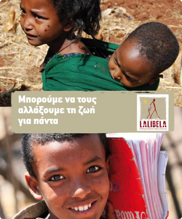 Ένας κόσμος με ίσα δικαιώματα, με πρόσβαση στην τροφή, τη στέγη, την εκπαίδευση, την πρόνοια, την υγεία, τη ψυχαγωγία είναι το όραμα του Συλλόγου Βοήθειας Παιδιών – Lalibela. Με αποστολές στην Αιθιοπία καθοριστικές για τη ζωή των παιδιών που υποστηρίζει, η Lalibela επίσης αγωνίζεται καθημερινά για να κάνει πράξη την αγάπη και το σεβασμό στα παιδιά. Βασικό μέλημα είναι η υλική και ηθική βοήθεια αυτών των παιδιών μέσα από τα Προγράμματα Αναδοχής. Ο Σύλλογος Βοήθειας Παιδιών – Lalibela είναι μια αμιγώς ελληνική προσπάθεια με πολλές διακρίσεις για το έργο του.